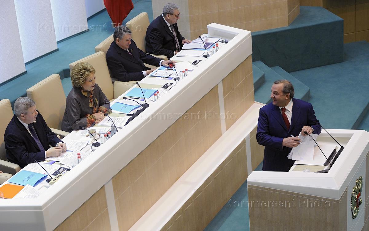 Пленарное заседание Совета Федерации России. Слева направо: представитель в Совете Федерации России от исполнительного органа государственной власти Псковской области Михаил Маргелов, первый заместитель председателя Совета Федерации России Александр Торшин и председатель Совета Федерации России Валентина Матвиенко на заседании.
