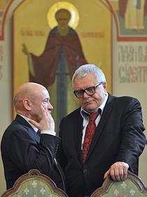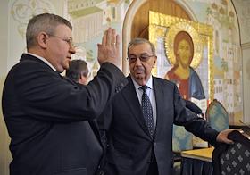 Руководитель Федерального агентства по печати и массовым коммуникациям (ФАПМК) России Михаил Сеславинский (слева) и совладелец группы "Ренова", президент фонда "Сколково" Виктор Вексельберг (справа) во время совместного заседания попечительского и общественного совета по изданию Православной Энциклопедии. Заседание прошло в храме Христа Спасителя.
