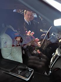 Председатель правительства России Дмитрий Медведев (слева) и олимпийская чемпионка по фигурному катанию Аделина Сотникова (справа) на церемонии вручения Фондом поддержки олимпийцев России автомобилей победителям и призерам ХХII Олимпийских зимних игр 2014 года в Сочи. Церемония прошла на Васильевском спуске.