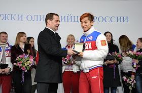 Председатель правительства России Дмитрий Медведев (слева) и трехкратный олимпийский чемпион по шорт-треку Виктор Ан (справа) на церемонии вручения Фондом поддержки олимпийцев России автомобилей победителям и призерам ХХII Олимпийских зимних игр 2014 года в Сочи. Церемония прошла на Васильевском спуске.