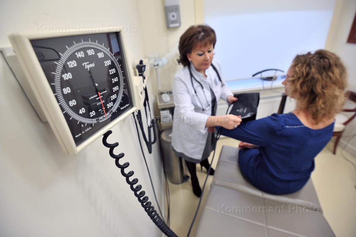 Онкологический центр SOFIA, созданный на базе медико-диагностического комплекса клиники "Медицина", где прошел пресс-завтрак, посвященный теме: "Современные методы диагностики и лечения онкологических заболеваний. Новые возможности отечественной медицины для пациентов". Пациент на приеме у врача.