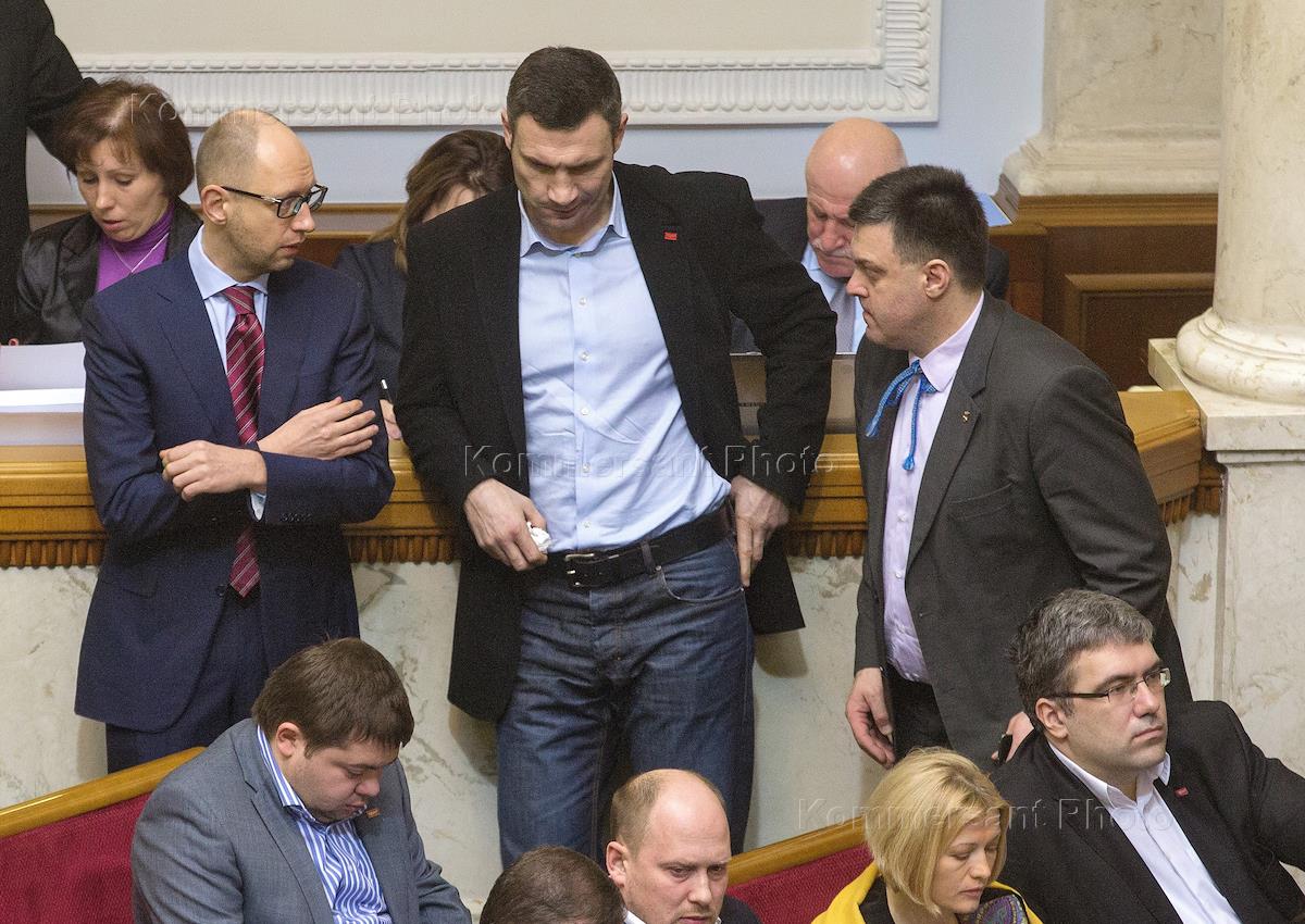 Заседание Верховной рады Украины (ВРУ). Голосование за новый состав Кабинета министров Украины (КМУ). Слева направо: новоизбранный премьер-министр Украины Арсений Яценюк, народный депутат Верховной рады Украины, лидер фракции Политической партии "УДАР (Украинский Демократический Альянс за Реформы) Виталия Кличко" Виталий Кличко и народный депутат Верховной рады Украины, лидер фракции Всеукраинское объединение "Свобода" Олег Тягныбок во время заседания.