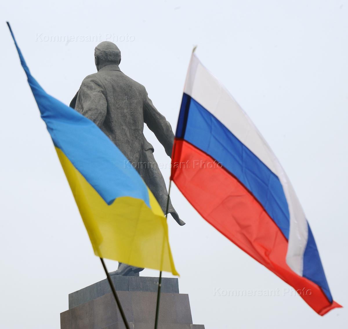 Political situation in Kharkov. Flags of Ukraine and Russia at the monument to Lenin.