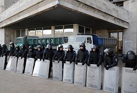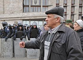 Сотрудники милиции у областной администрации и думы после эвакуации народных ополченцев, захвативших здание в ходе стихийного митинга. Поводом для эвакуации стало телефонное сообщение, что в здании заложено взрывное устройство.