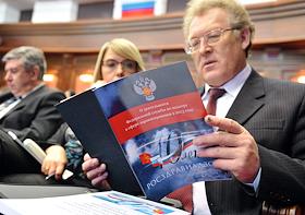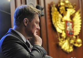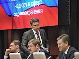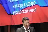 Временно исполняющий обязанности руководителя Федеральной службы по надзору в сфере здравоохранения Михаил Мурашко (в центре) во время расширенного заседания коллегии Росздравнадзора "Об итогах работы Федеральной службы по надзору в сфере здравоохранения и ее территориальных органов по субъектам Российской Федерации в 2013 году и планах на 2014 год". Заседание прошло здании Министерства труда и социальной защиты России.