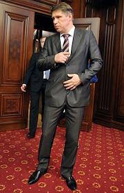 Временно исполняющий обязанности руководителя Федеральной службы по надзору в сфере здравоохранения Михаил Мурашко (слева) и заместитель министра здравоохранения России Айрат Фаррахов (справа) во время расширенного заседания коллегии Росздравнадзора "Об итогах работы Федеральной службы по надзору в сфере здравоохранения и ее территориальных органов по субъектам Российской Федерации в 2013 году и планах на 2014 год". Заседание прошло здании Министерства труда и социальной защиты России.
