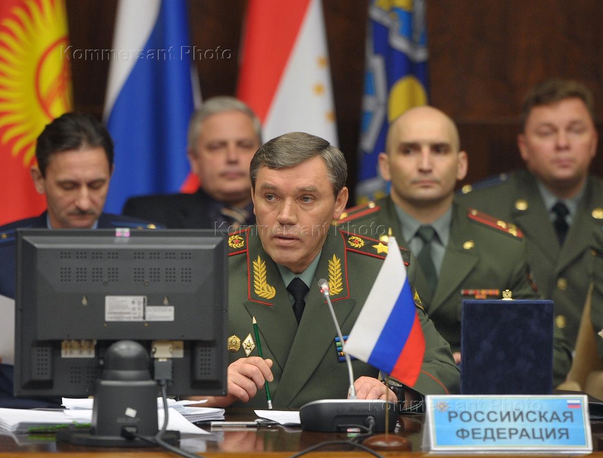 Начальник Генерального штаба Вооруженных сил России — первый заместитель министра обороны России, генерал армии Валерий Герасимов во время заседания Военного комитета, созданного при Совете министров обороны государств-членов Организации Договора о коллективной безопасности.