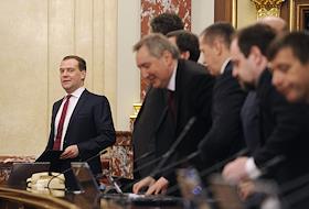 Председатель правительства России Дмитрий Медведев (слева) и заместитель председателя Правительства России Дмитрий Рогозин (справа) во время заседания Правительства России в Доме правительства России.