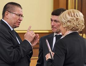Слева направо: министр сельского хозяйства России Николай Федоров, министр труда и социальной защиты России Максим Топилин, заместитель председателя Правительства России Ольга Голодец во время заседания Правительства России в Доме правительства России.