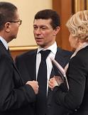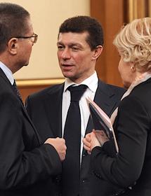 Слева направо: министр сельского хозяйства России Николай Федоров, министр труда и социальной защиты России Максим Топилин, заместитель председателя Правительства России Ольга Голодец перед началом заседания правительства России в Доме правительства России.