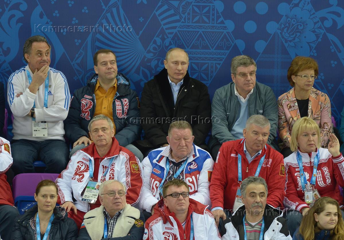 XI Зимние Паралимпийские игры Сочи 2014. Слева направо: министр спорта России Виталий Мутко, председатель правительства России Дмитрий Медведев, президент России Владимир Путин и президент Международного Олимпийского комитета Томас Бах с супругой Клаудией на трибуне во время матча по следж-хоккею между сборными командами России и Кореи.