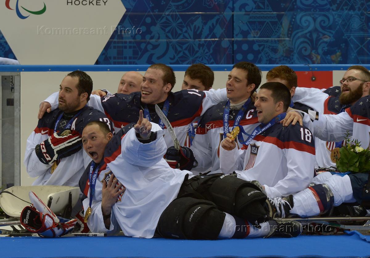 XI Зимние Паралимпийские игры Сочи 2014. Игроки сборной США, завоевавшие золотые медали на соревнованиях по следж-хоккею во время медальной церемонии.