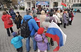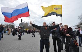 Референдум о статусе Автономной республики Крым (АРК). Жители Севастополя с российским флагом на площади города.