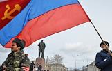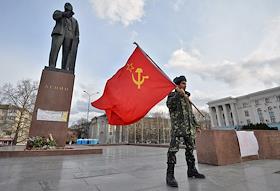 Референдум о статусе Автономной республики Крым (АРК). Житель Симферополя с флагом СССР у памятника В.И.Ленину.