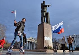 Референдум о статусе Автономной республики Крым (АРК). Жители Симферополя с флагами России и Крыма у памятника В.И.Ленину.