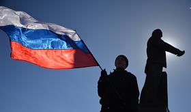 Референдум о статусе Автономной республики Крым (АРК). Мужчина держит Государственный Флаг России на площади Ленина.