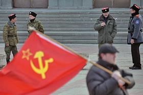 Референдум о статусе Автономной республики Крым (АРК). Житель Симферополя с флагом СССР у памятника В.И.Ленину.