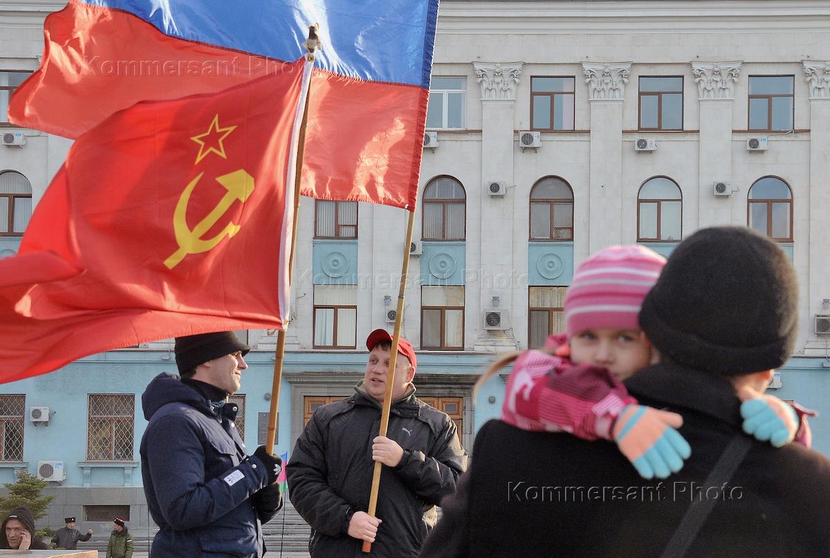 Референдум о статусе Автономной республики Крым (АРК). Жители Симферополя с флагами России и СССР.