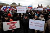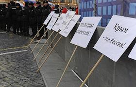Акция в поддержку референдума в Крыму. Митинг-концерт "Мы вместе!" прошел на Красной площади. Участники Акции с плакатами "Вместе навсегда!" и "Чужого не надо, своего не отдадим!".
