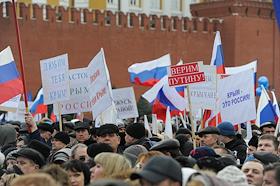 Акция в поддержку референдума в Крыму. Митинг-концерт "Мы вместе!" прошел на Красной площади. Плакаты "Севастополь. Крым. Россия!", "Горжусь страной!", "Путин прав!", Молодцы Крымчане!", "Любим тебя Крым!".