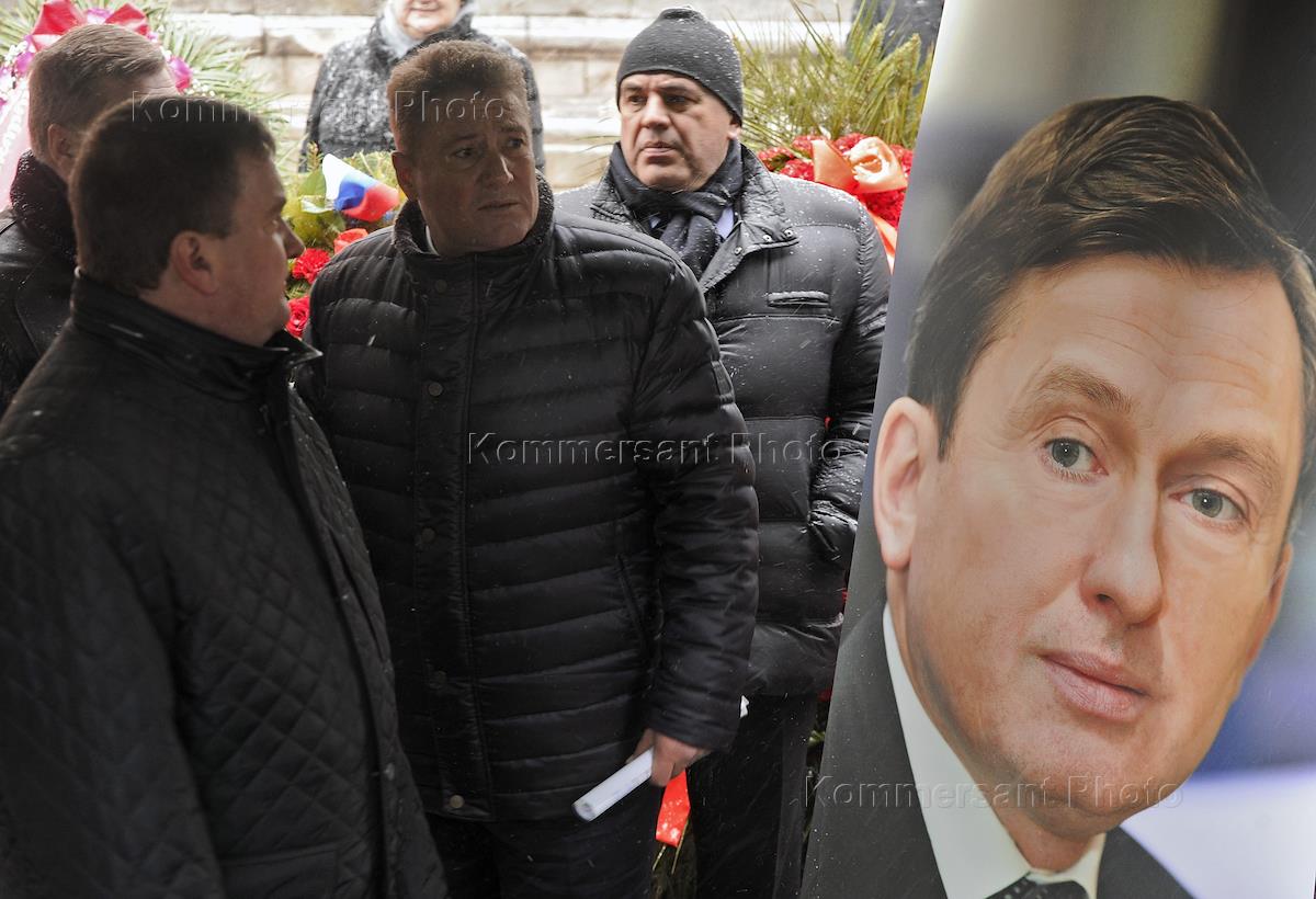 Председатель Совета директров Холдинга межрегиональных распределительных сетевых компаний Георгий Боос (в центре) во время гражданской панихиды по бывшему министру труда и социального развития, бывшему члену Совета Федерации России Александру Починку на Новодевичьем кладбище.