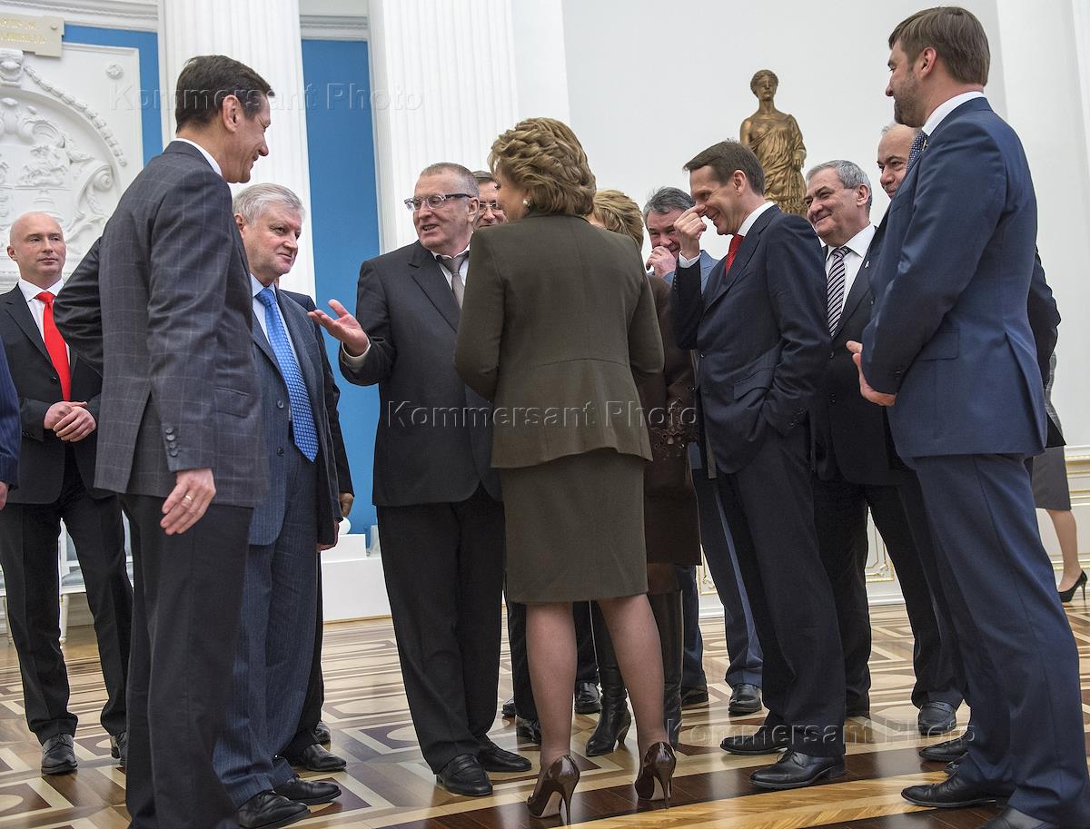 Церемония подписания Федерального конституционного закона "О принятии в Российскую Федерацию Республики Крым и образовании в составе РФ новых субъектов – Республики Крым и города федерального значения Севастополя". Слева направо: председатель Совета Федерации (СФ) России Валентина Матвиенко, лидер Либерально-демократической партии России (ЛДПР), член комитета Государственной думы (ГД) России по обороне Владимир Жириновский, заместители председателя ГД России Николай Левичев, Людмила Швецова, председатель ГД России Сергей Нарышкин, заместители председателя СФ России Юрий Воробьев, Ильяс Умаханов, заместитель председателя ГД России Сергей Железняк и президент России Владимир Путин во время церемонии в Екатерининском зале Кремля.