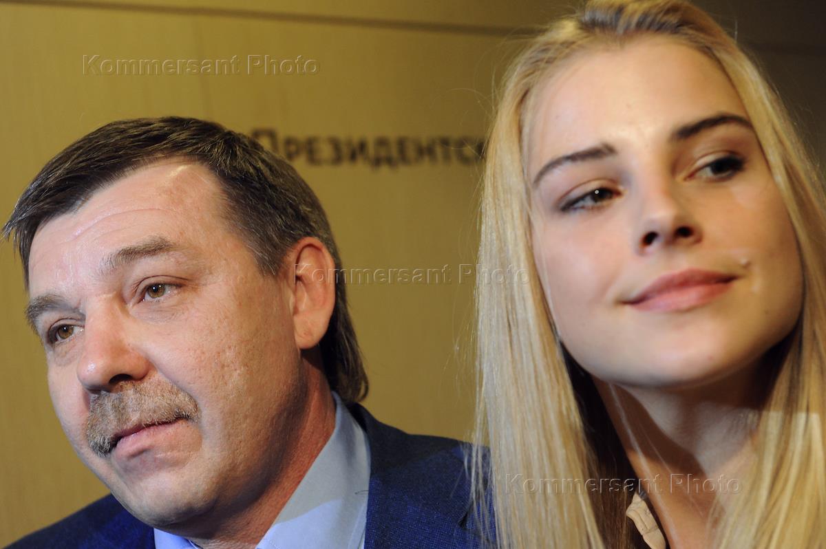 Главный тренер мужской сборной России по хоккею Олег Знарок (слева) с дочерью Алисой (справа) после пресс-конференции в международном мультимедийном пресс-центре РИА Новости.