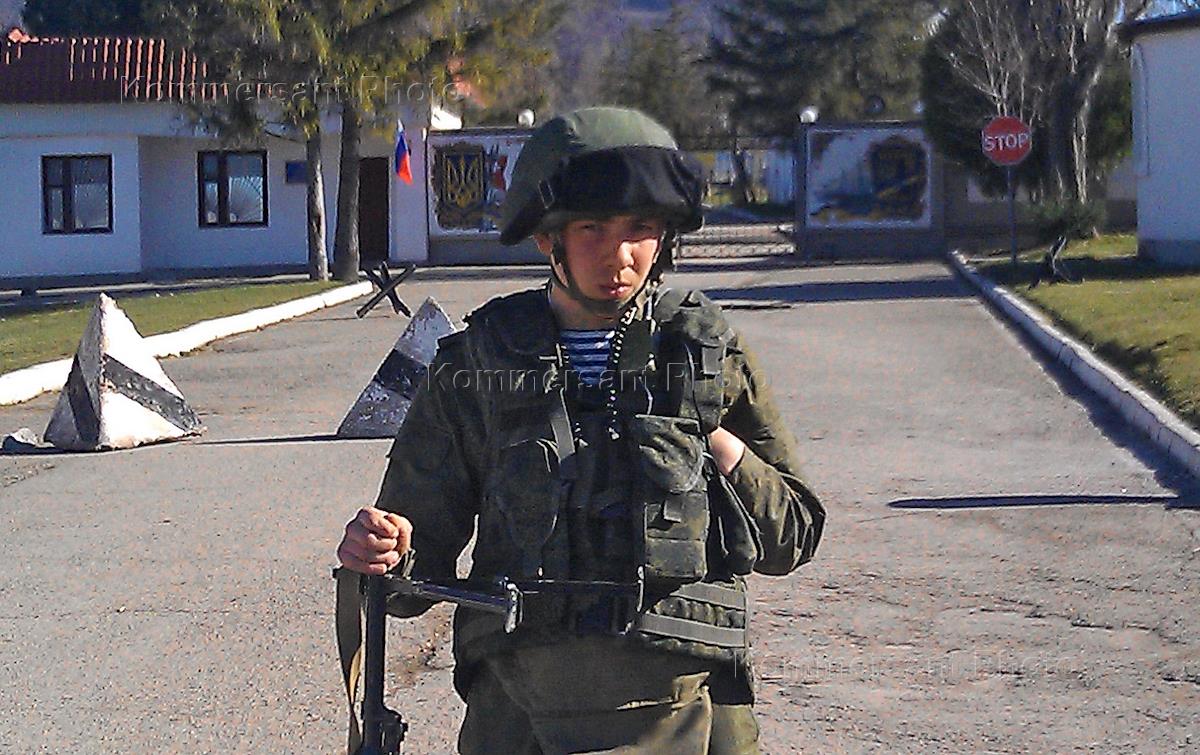 Российские солдаты охраняют подход на передшедшей к российской армии бывшей украинской военной базе, в поселке Перевальное.