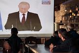 Молодые люди в кафе во время просмотра выступления президента России Владимира Путина.