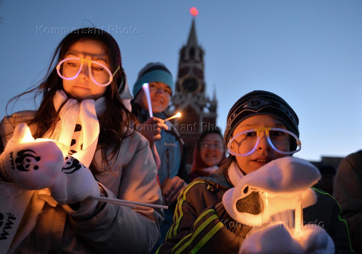 Виды Москвы. Участники экологической акции "Час земли" на Красная площадь во время акции.