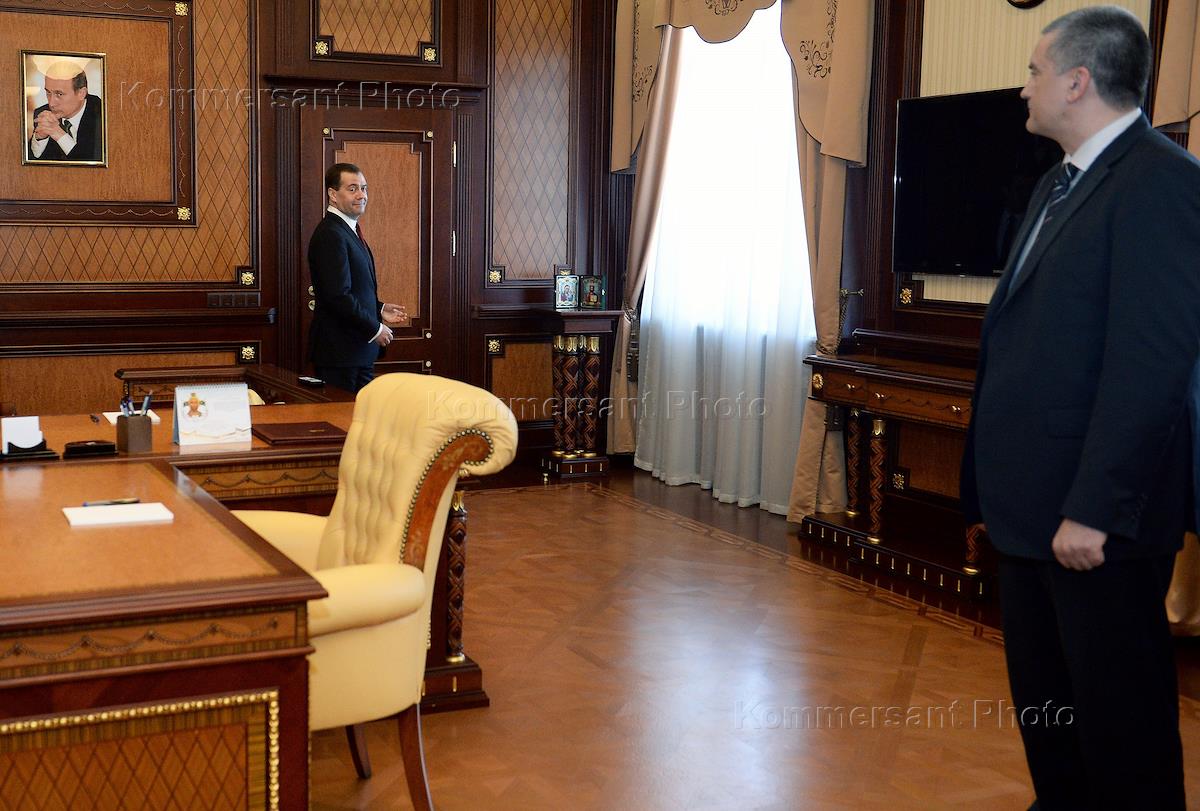 Председатель правительства России Дмитрий Медведев (слева) и премьер-министр республики Крым Сергей Аксенов (справа) на совещании по социально-экономическому развитию Крыма и Севастополя.