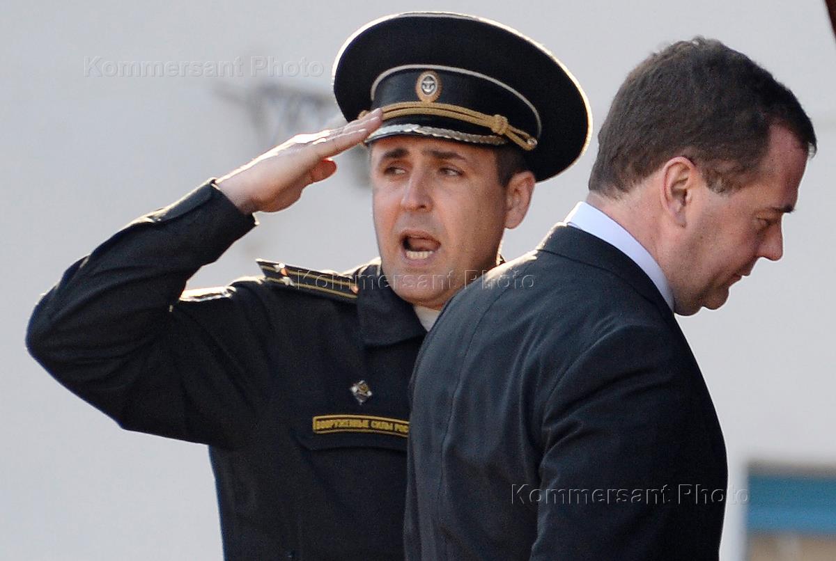 Председатель правительства России Дмитрий Медведев (четвертый слева), заместитель председателя правительства России Дмитрий Рогозин (в центре) и министр промышленности и торговли Денис Мантуров (справа) во время посещения 13-го судоремонтного завода.