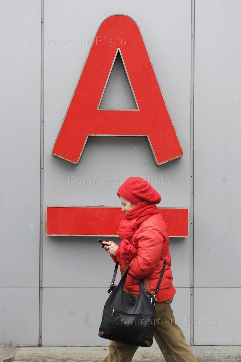 Office building in the reflection of advertising credits from the bank "Russian Standard".