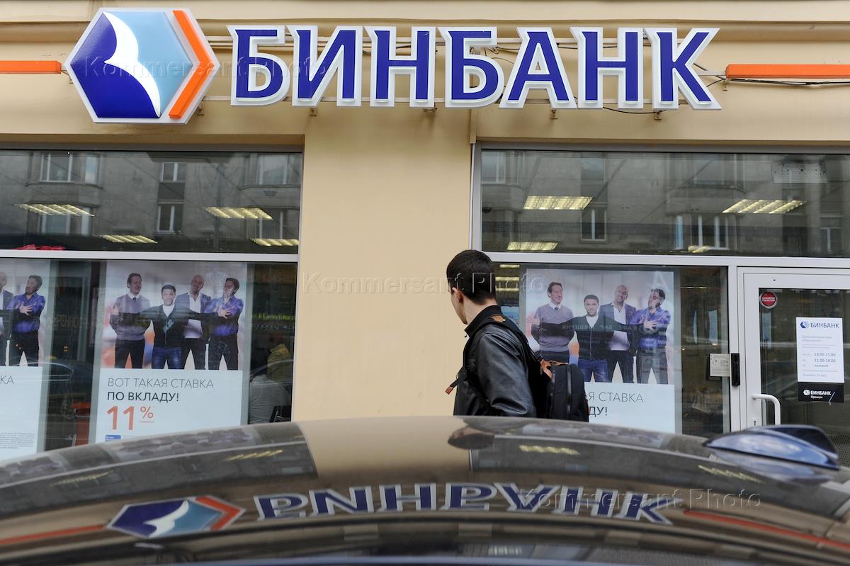 Office building in the reflection of advertising credits from the bank "Russian Standard".