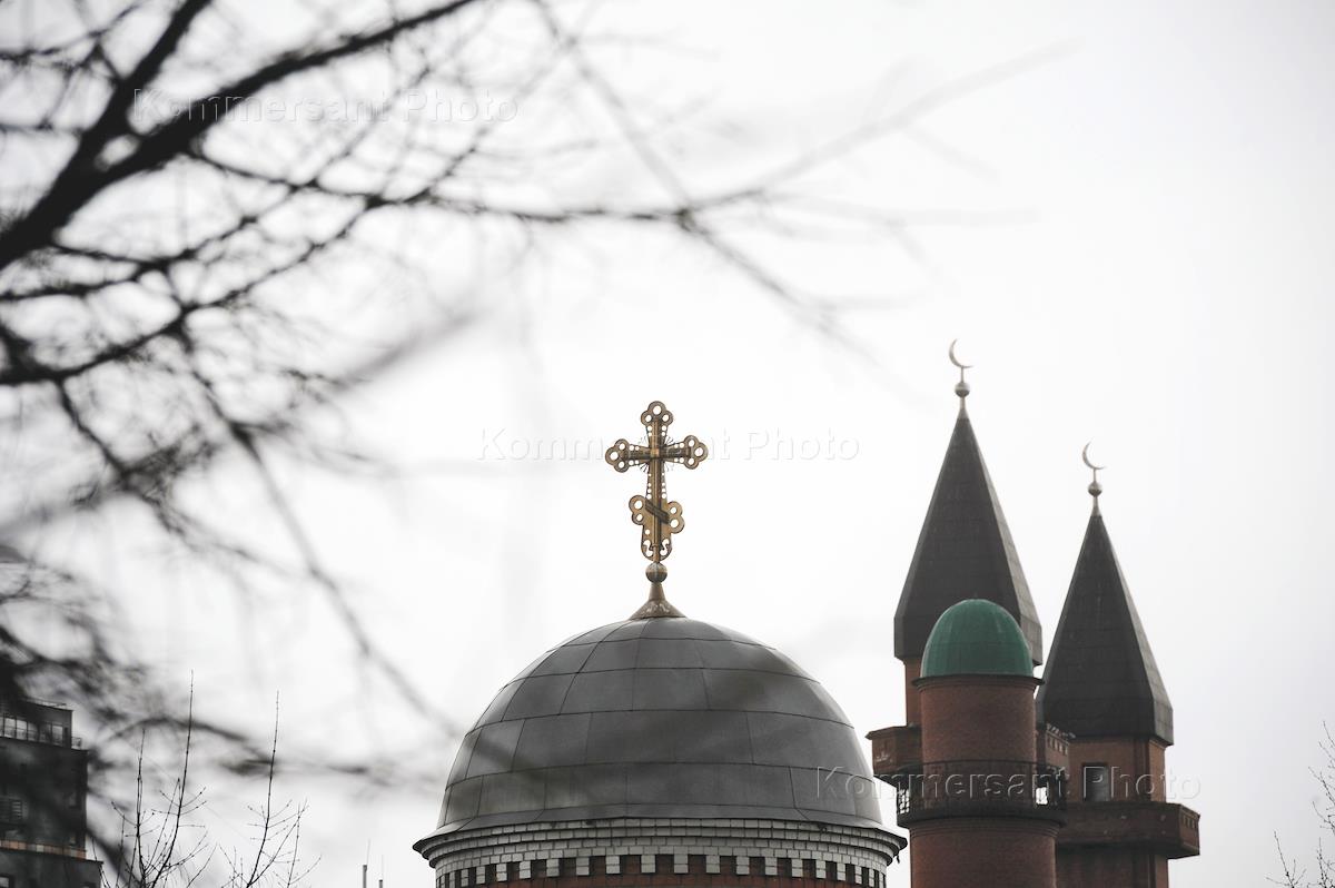 Office building in the reflection of advertising credits from the bank "Russian Standard".