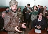 Представитель правительства республики Чечня Мовлади Удугов (слева) во время встречи с секретарем Совета Безопасности России, предпринимателем Борисом Березовским (справа) в доме правительства Чеченской республики.