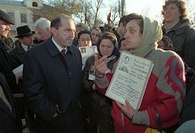 Секретарь Совета безопасности России, предприниматель Борис Березовский (в центре) во время встречи с жителями республики.