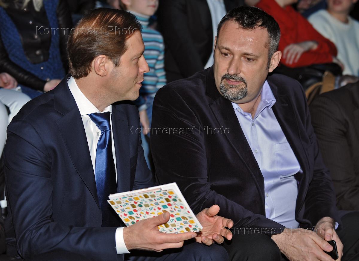 Mercedes-Benz Fashion Week Russia. Министр промышленности и торговли России Денис Мантуров (слева) и генеральный продюсер Russian Fashion Week Александр Шумский (справа) на показе школьных коллекций для начальных, средних и старших классов.