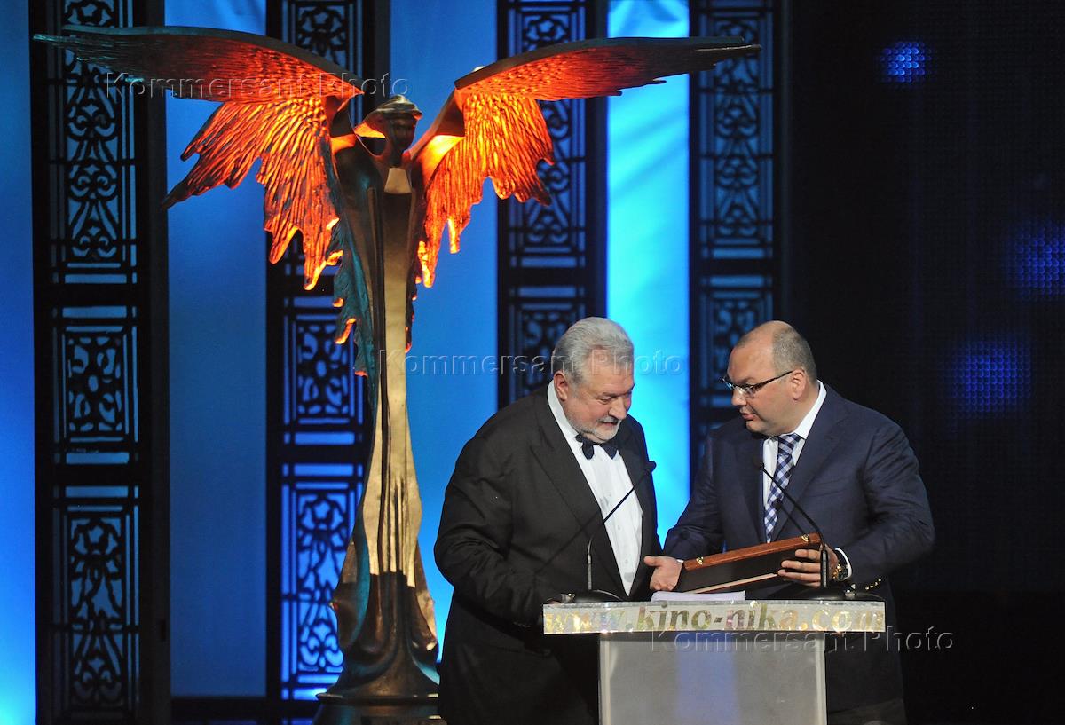 Кинорежиссер Юлий Гусман (слева) и генеральный директор Информационного телеграфного агентства России "ИТАР -ТАСС" Сергей Михайлов (справа) во время торжественной XXVII церемонии вручения национальной кинематографической премии "Ника" в Московском государственном академическом театре оперетты.