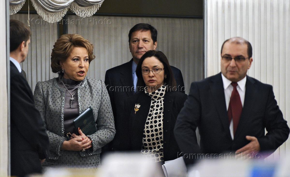 Слева направо: председатель Совета Федерации России Валентина Матвиенко, первый заместитель председателя Государственной думы России Александр Жуков, председатель Центрального Банка России Эльвира Набиуллина и президент Ассоциации Российских банков (АРБ) Гарегин Тосунян во время XXV съезд Ассоциации российских банков. Съезд прошел в Колонном зале Дома Союзов.