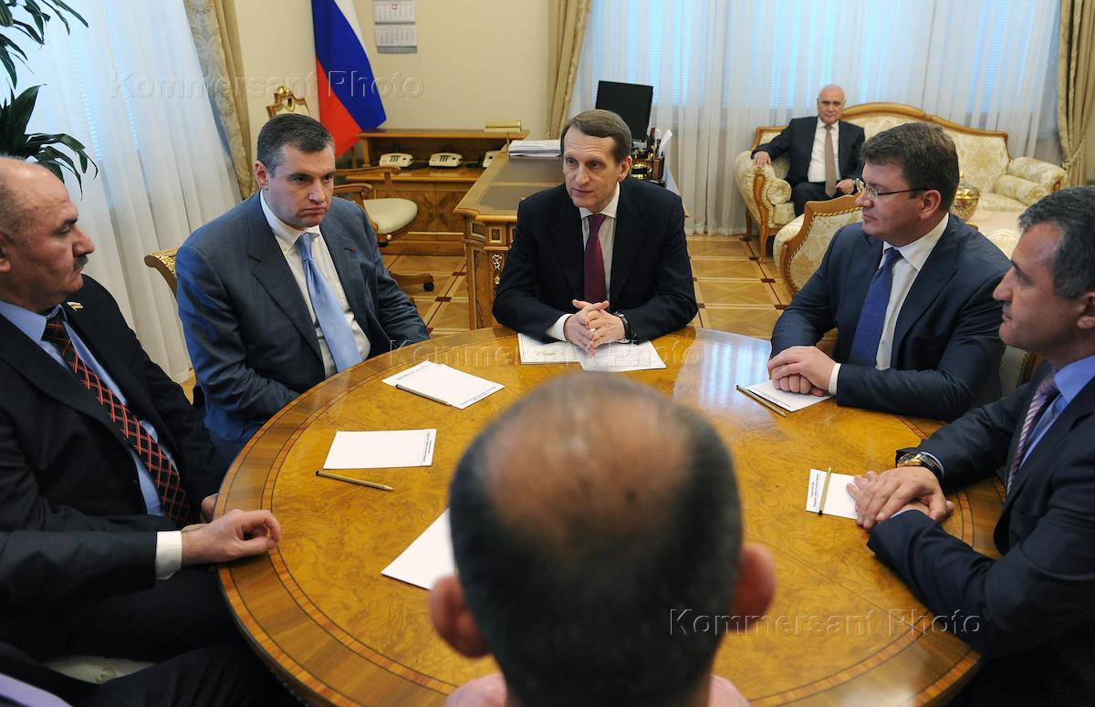 Председатель Государственной думы России Сергей Нарышкин (в центре) во время встречи с лидерами политических партий Южной Осетии.