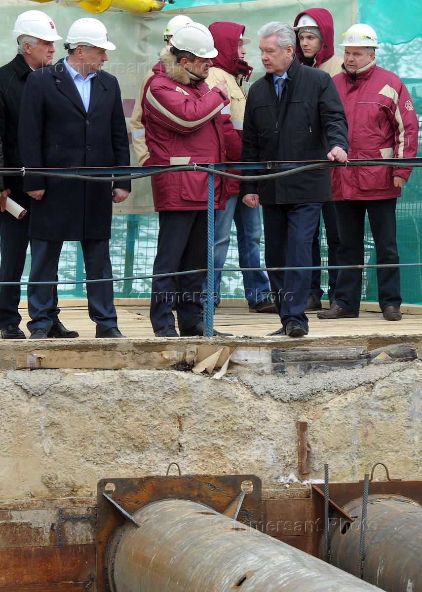 Moscow Mayor Sergei Sobyanin (center) during a visit to the metro station construction "Rumyantsevo".