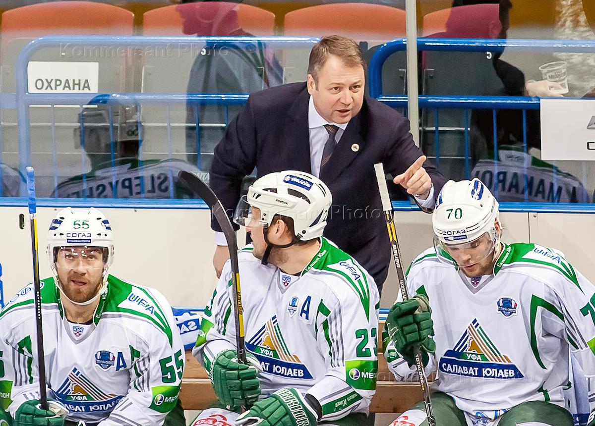 Континентальная хоккейная лига. Восточная конференция. Плей-офф. Матч между командами "Металлург" (Магнитогорск) и "Салават Юлаев" (Уфа) прошел на Ледовой арене "Металлург". Главный тренер ХК "Салават Юлаев" Владимир Юрзинов (в центре) во время матча.