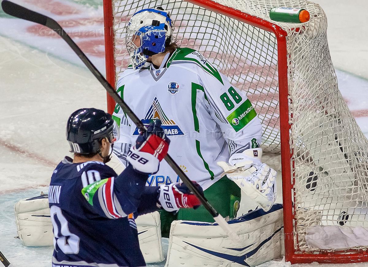 Continental Hockey League. Eastern Conference. Playoffs. Match between teams "Metallurg" (Magnitogorsk) and "Salavat Yulaev" (Ufa) passed on the ice arena "Metallurg". Hockey player "Metallurg" Sergei Mozyakin (left) and goalkeeper "Salavat Yulaev" Andrei Vasilevski (right) during the match.