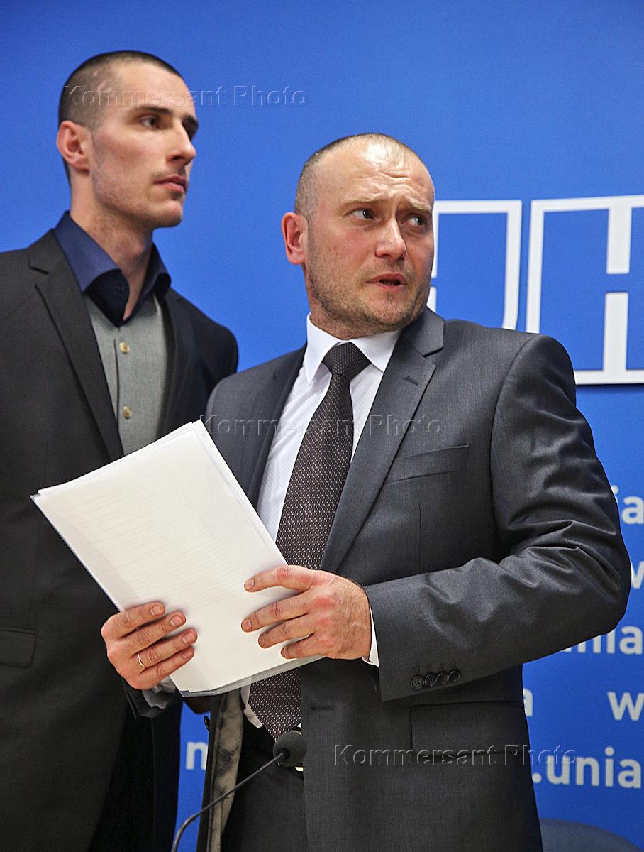 Лидер "Правого сектора", кандидат в президенты Украины Дмитрий Ярош (справа) во время пресс-конференции в УНИАН.