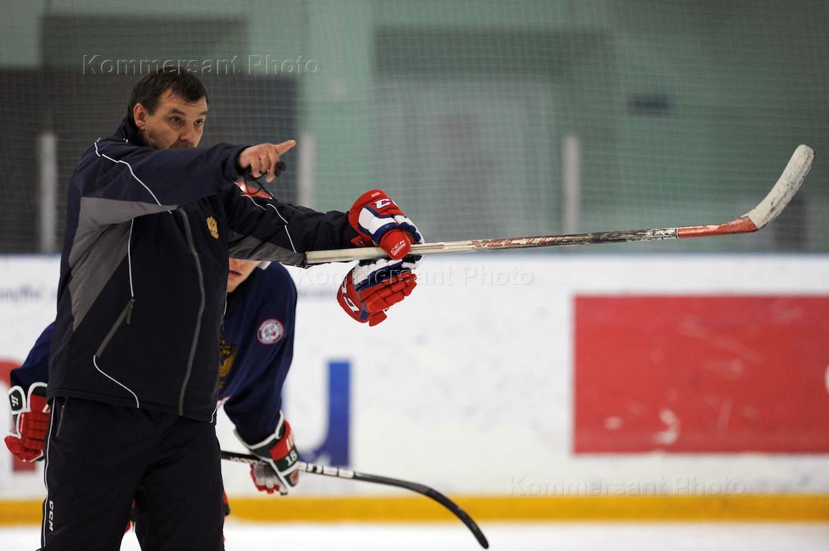 Главный тренер мужской сборной России по хоккею Олег Знарок (слева) во время открытой тренировки Национальной сборной по хоккею, в Центре зимних видов спорта в Новогорске.