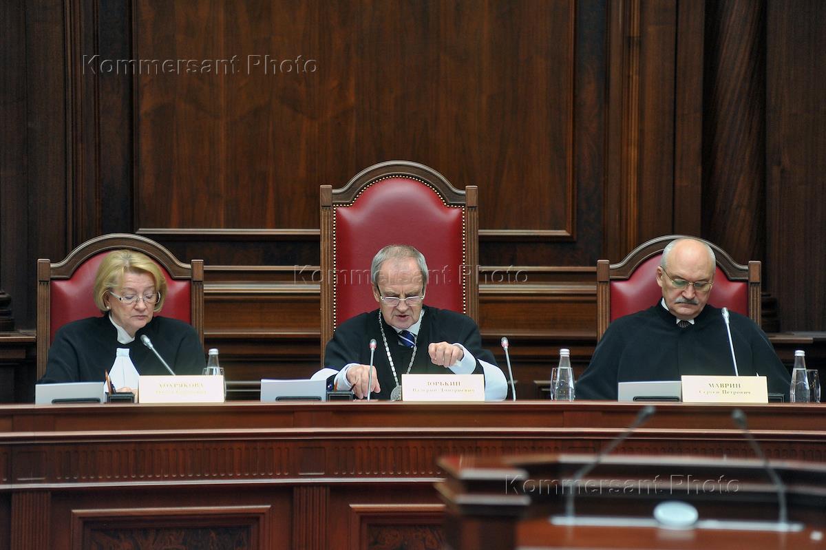 From left to right: Deputy Chairman of the Constitutional Court Olga Hohriakova, chairman of the Constitutional Court Valery Zorkin and deputy chairman of the Constitutional Court Sergei Mavrin during a meeting of the Constitutional Court.