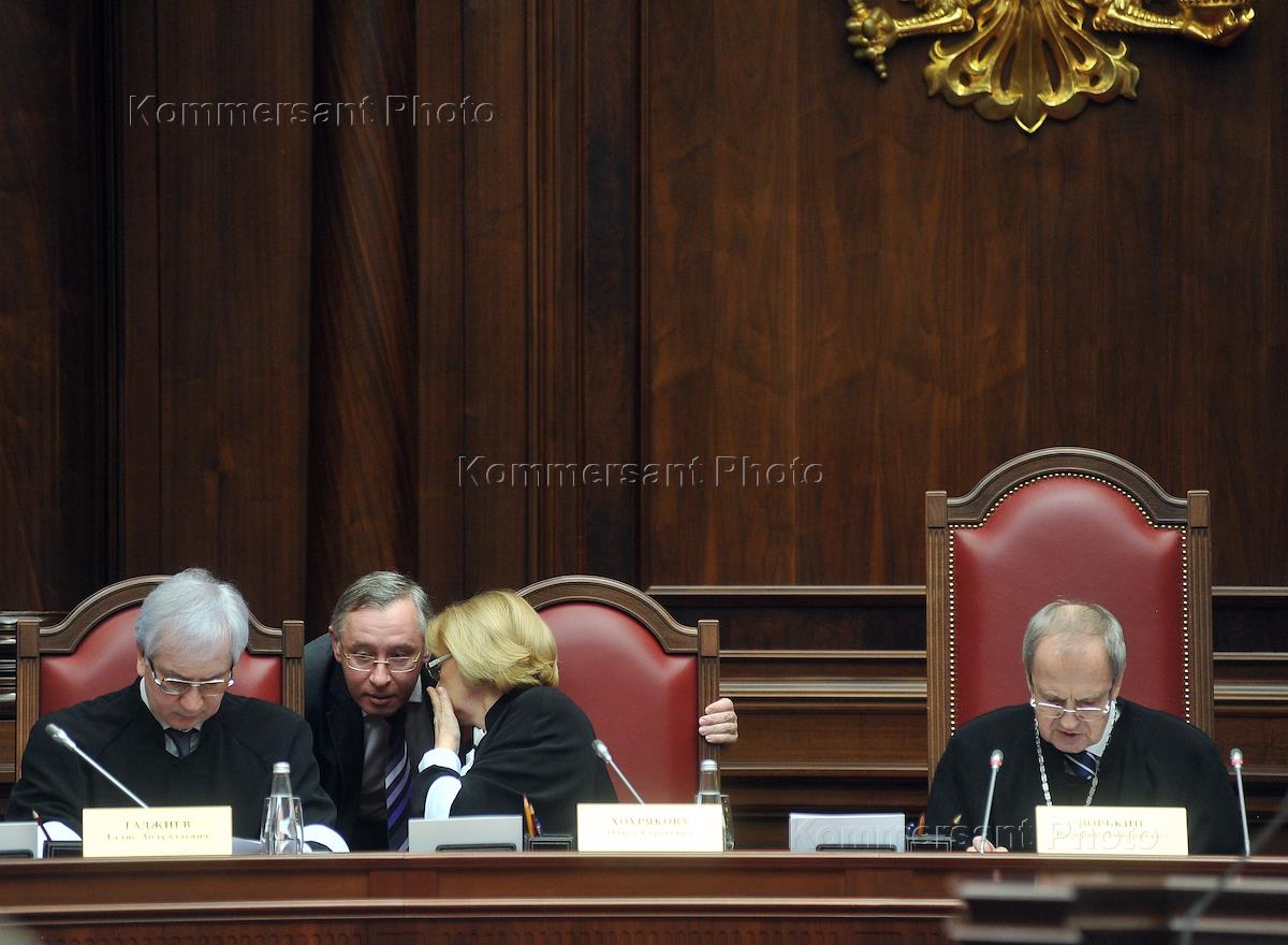From left to right: Deputy Chairman of the Constitutional Court Olga Hohriakova, chairman of the Constitutional Court Valery Zorkin and deputy chairman of the Constitutional Court Sergei Mavrin during a meeting of the Constitutional Court.