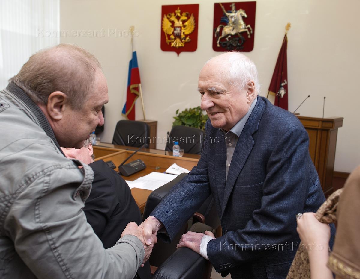 Художественный руководитель театра "Ленком" Марк Захаров (cлева) и депутат Московской городской Думы Евгений Герасимов (справа) во время заседания цеха столичных деятелей культуры в рамках Комиссии Московской городской Думы по культуре и массовым коммуникациям.
