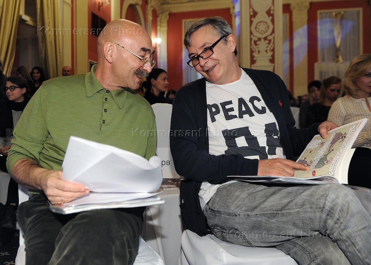 Поэт Андрей Орлов (Орлуша) (cлева) и президент Санкт-Петербургского общественного фонда Анатолия Собчака Людмила Нарусова (справа) на пионерских чтениях журнала "Русский пионер" в Royal Hall Центрального Московского ипподрома.